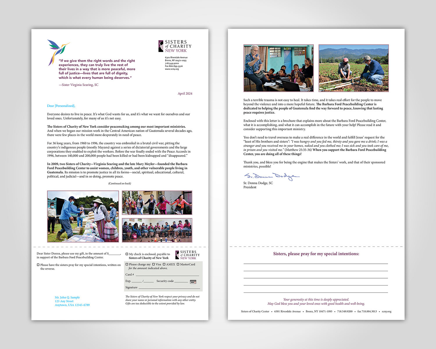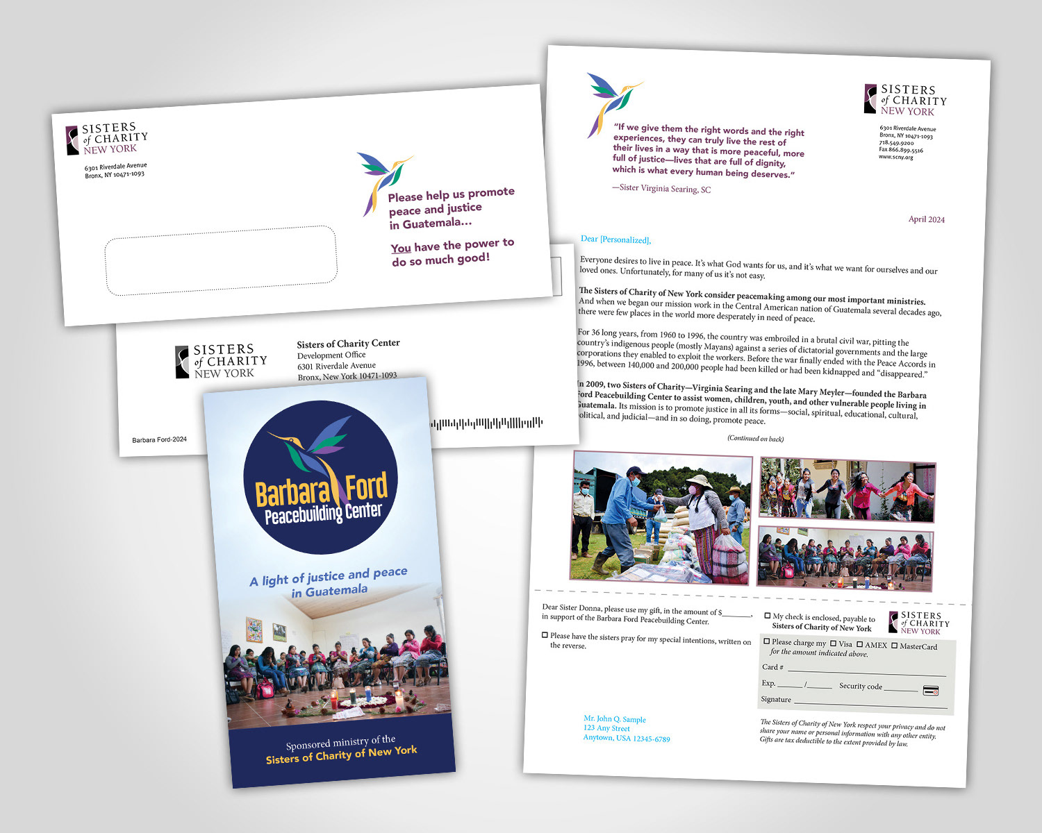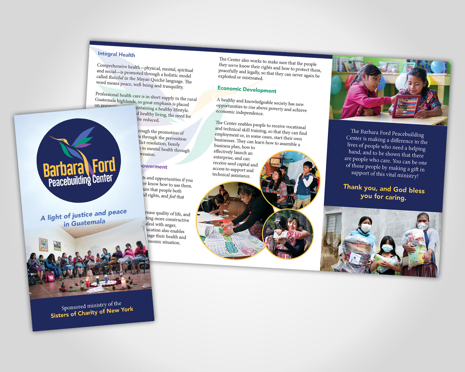 The Sisters of Charity, based in New York City, sponsor several ministries, including the Barbara Ford Peacebuilding Center in Guatemala. They wanted to spread awareness about this important mission and appeal to potential donors. We created a direct mail package with a letter and informative brochure. I created a clean design featuring the colorful bird in their logo. The crisp photos illustrate the benefits of BFPC and its positive impact on the people they serve. Completed with the team at Riger Marketing Communications