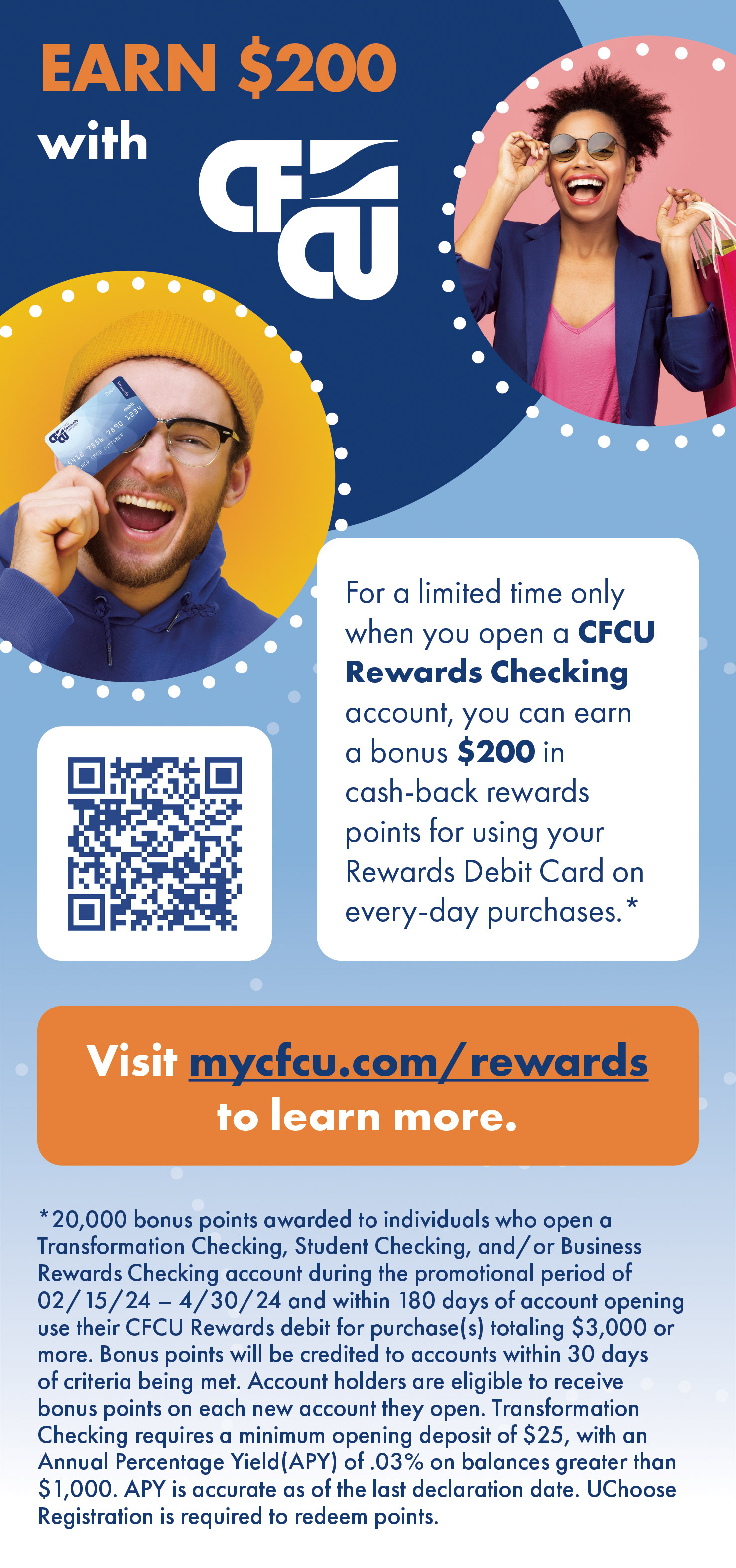 CFCU Community Credit Union wanted to promote a limited-time offer for customers who opened a Rewards Checking account. We started with eye-catching digital ads, then applied that design to various assets including newspaper ads, website banners, digital signage, and customer-facing outlets. Completed with the team at Riger Marketing Communications