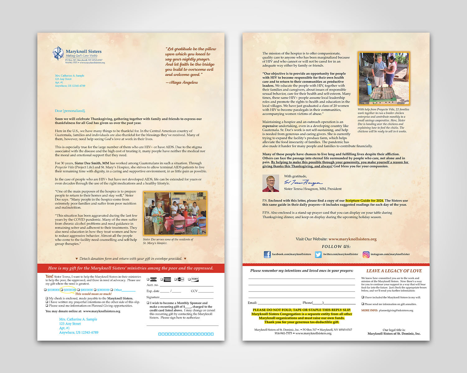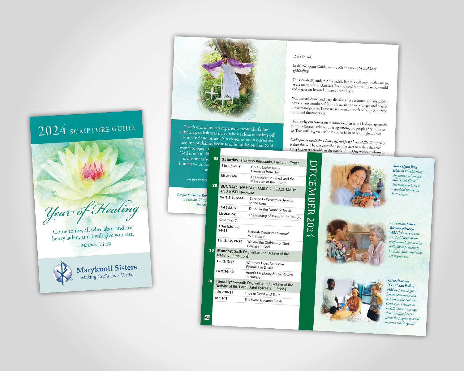 The Maryknoll Sisters, based in Westchester County, NY, help people through their mission work in 19 places around the world. Every month, they send appeal mailings to raise funds for their mission efforts. For the November mailing, they wanted to include a Thanksgiving theme with a 64-page Scripture Guide booklet included. I used traditional Thanksgiving imagery/colors to appeal to an older audience. The design is clean, colorful, and easy to read. Recipients are encouraged to donate through the connection of the Thanksgiving season and Sister Dee Smith’s mission in Guatemala. For the Scripture Guide, the client requested a separate design to match the “Year of Healing” theme. I used teal colors and watercolor imagery to evoke feelings of calmness and renewal. Completed with the team at Riger Marketing Communications